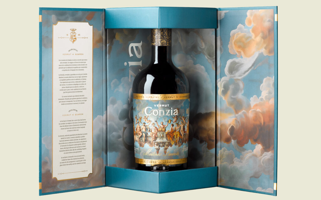 La etiqueta continúa ese diálogo. Representa una escena clásica, casi litúrgica, que remite al valor que siempre tuvo la fórmula original dentro de la casa: algo que se transmite, que se interpreta, que se cuida. Ese lenguaje pictórico —más cercano a un fresco que a una etiqueta convencional— expresa mejor que las palabras la naturaleza de Conzia: una creación que existe gracias a quienes la han protegido durante generaciones y que, aún hoy, mantiene algo de misterio.